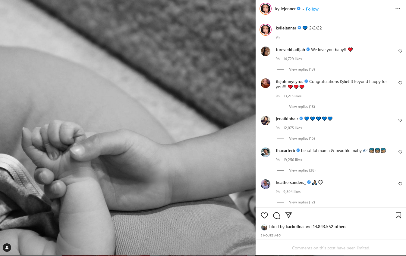 Кајли је срећне вести поделила на инстаграму веома емотивном црно-белом фотографијом, а у коментарима су јој честитале многобројне светске звезде.