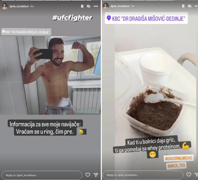 Иако се налази у болничкој постељи, Ђорђе је открио и да се осећа доста боље, па је уз фотографије написао да "Нема предаје", али и да једе гриз са протеинима, а својим пријатељима је поручио да се ускоро враћа у ринг још јачи.