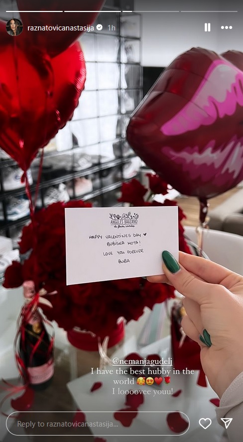 Младу певачицу је супруг обрадовао бројним поклонима, а све је поделила са својим пратиоцима на Инстаграму. Међу поклонима се нашло цвеће, разне чоколадице, балони у облику срца и пољупца, шампањац, али и симпатичну поруку: