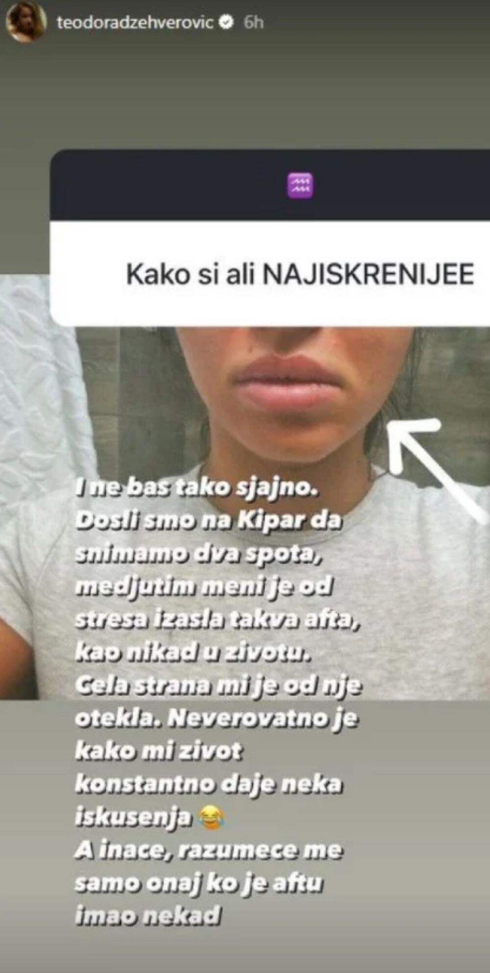 - И не баш тако сјајно. Дошли смо на Кипар да снимамо два спота, међутим, мени је од стреса изашла таква афта, као никад у животу. Цела страна ми је од ње отекла. Невероватно је како ми живот константно даје нека искушења. А иначе, разумеће ме само онај ко је афту имао некад - написала је Теодора и објавила фотографију како изгледа.