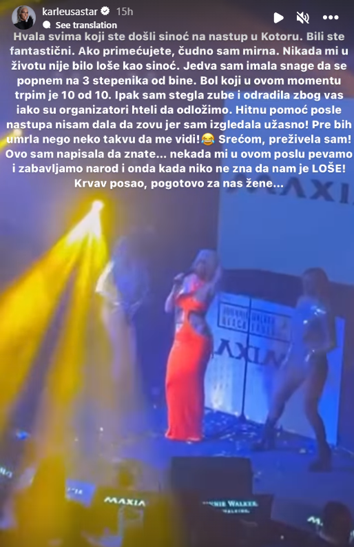 - Једва сам имала снаге да се попнем три степеника од бине. Бол који у овом моменту трпим је 10 од 10. Ипак сам стегла зубе и одрадила због вас, иако су организатори хтели да одложимо. Хитну помоћ после наступа нисам дала да зову јер сам изгледала ужасно! Пре бих умрла него неко такву да ме види. Срећом преживела сам. Ово сам написала да знате... Некада ми у овом послу певамо и забављамо народ и онда када нико не зна да сам ја лоше. Крвав посао, поговото за нас жене.