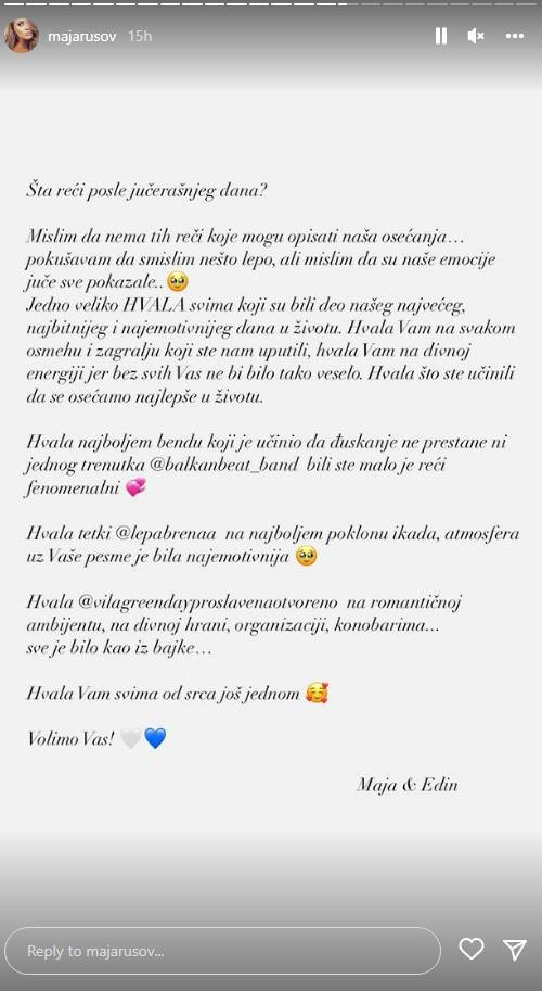 - Нема тих речи које могу описати наша осећања. Покушавам да смислим нешто лепо, али мислим да су наше емоције јуче све рекле. Хвала свим гостима на сваком осмеху, загрљају и дивној енергији. Хвала тетки Лепој Брени на најбољем поклону икада, атмосфера уз ваше песме је била најемотивнија. Хвала свима још једном. Волимо вас. Маја и Един - написала је Маја на Инстаграму.