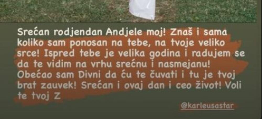 - Срећан рођендан, Анђеле мој! Знаш и сама колико сам поносан на тебе, на твоје велико срце! Испред тебе је велика година и радујем се да те видим на врху срећну и насмејану! Обећао сам Дивни да ћу те чувати и ту је твој брат заувек! Срећај и овај дан и цео живот! Воли те твој З - написао је Бирташевић, а Јелена је такође поделила његов стори на свом профилу.