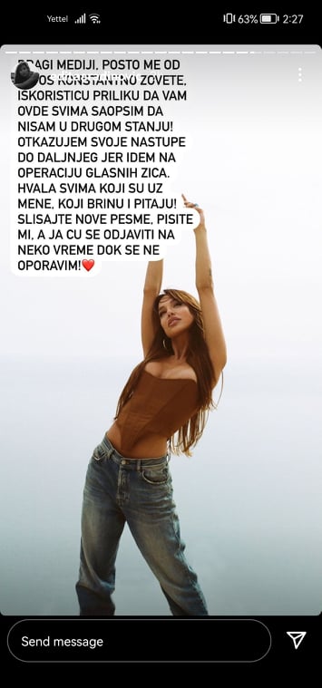 - Драги медији, пошто ме од јутрос константно зовете искористићу прилику да вам овде свима саопштим да нисам у другом стању! Отказујем своје наступе до даљњег јер идем на операцију гласних жица. Хвала свима који су уз мене, који брину и питају! Слушајте нове песме, пишите ми, а ја ћу се ођавити на неко време док се не опоравим! - написала је Едита.