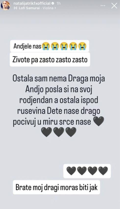 - Анђеле наш, животе, па зашто, зашто, зашто? Остала сам нема драга моја, Анђо, пошла си на рођендан, а остала испод рушевина, дете наше драго. Почивај у миру, срце наше - написала је Наталија.