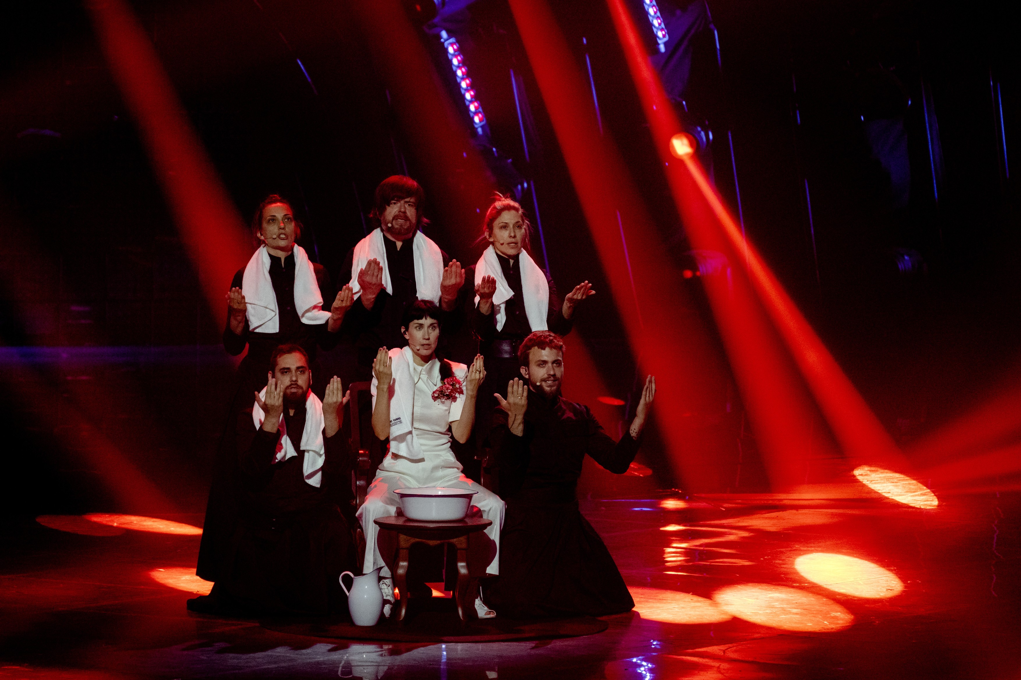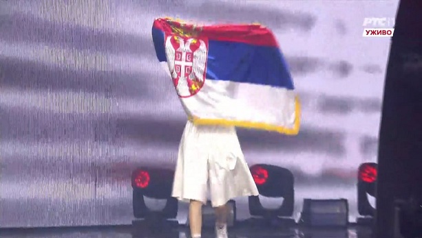 На самом почетку, представници свих земаља продефилевали су сценом на којој ће вечерас наступити. Спрска представница скромно је изашла, прекривена Српском заставом која јој је чак и лице покрила, а онда се скромно поклонила публици.