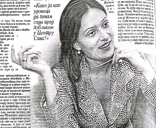 - После силних написа и свега што прати мој живот, питала сам маму да ли је поносна на мене. Дуго је размишљала и онда је рекла да моја слава има горак укус. Исувише је то велики терет за њена плећа. Јер, мене пажња јавности прати од најранијих дана. И мама рече, све је то лепо, сем две ствари. Никад није могла да замисли да неће моћи, као све баке, да шета са унучићима где хоће. Затим, моја лична трагедија је нешто што неће моћи да преболи. Иако су се родитељи у почетку противили мојој вези са Жељком, због велике разлике у годинама, они су га јако волели. По његов смрт, мама је у тренутку остарила за цео живот.