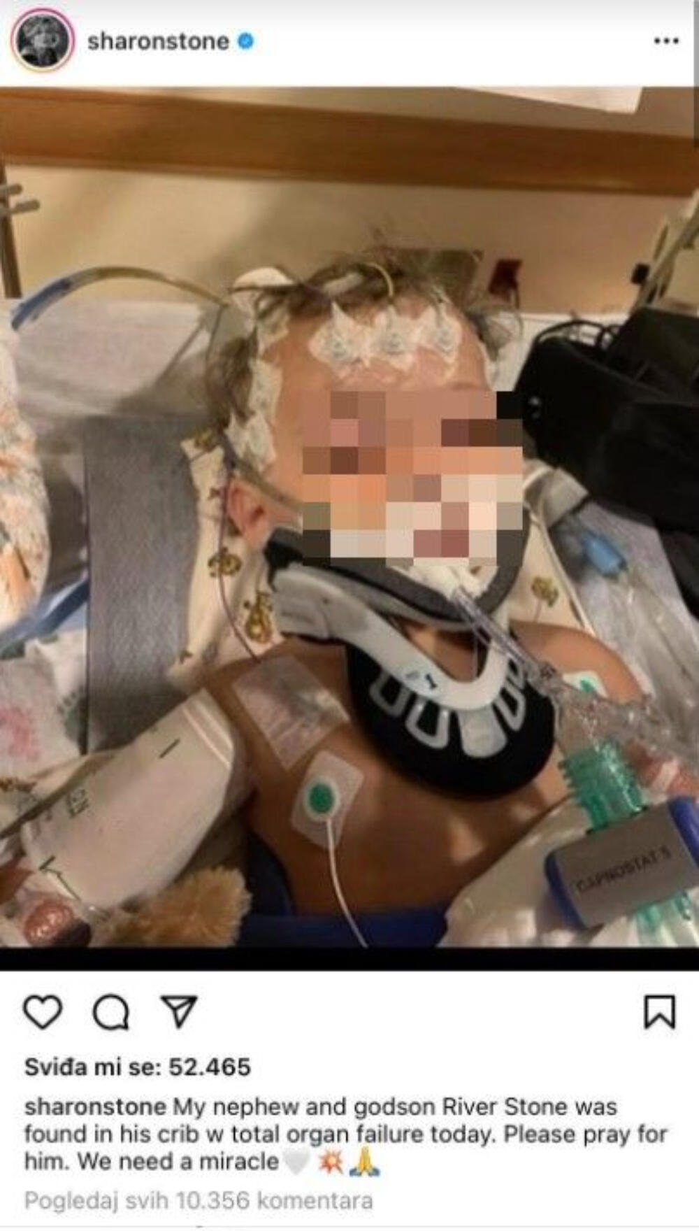 Шерон Стоун, данас је на друштвеној мрежи Инстаграм објавила фотографију свог малог нећака и кумића из болничке постеље.