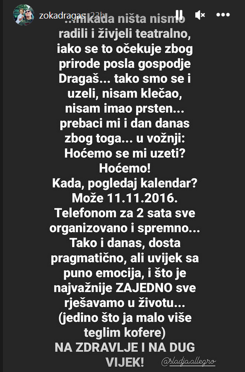 "Никада ништа нисмо радили и живели театрално иако се то очекује због природе посла госпође Драгаш. Тако смо се и узели. Нисам клечао, нисам имао прстен…Пребаци ми и дан данас због тога… У вожњи: 'Хоћемо се узети?', 'Хоћемо', погледали календар, одлучили се за 11.1.2016. телефоном за два сата све организовали. Тако и данас, доста прагматично, али увек са пуно емоција и што је најважније заједно све решавамо у животу (једино што ја мало више теглим кофере)".
