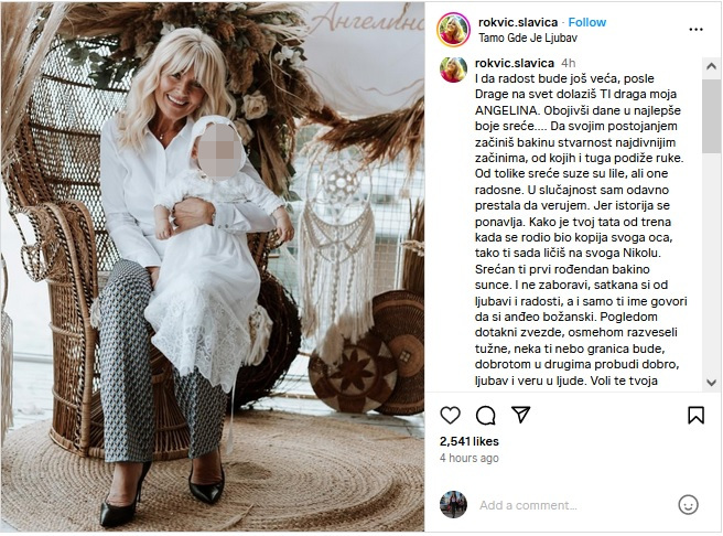 – И да радост буде још већа, после Драге на свет долазиш ти драга моја Ангелина. Обојивши дане у најлепше боје среће…. Да својим постојањем зачиниш бакину стварност најдивнијим зачинима, од којих и туга подиже руке. Од толике среће сузе су лиле, али оне радосне. У случајност сам одавно престала да верујем. Јер историја се понавља. Како је твој тата од трена када се родио био копија свога оца, тако ти сада личиш на свога Николу. Срећан ти први рођендан бакино сунце. И не заборави, саткана си од љубави и радости, а и само ти име говори да си анђео божански. Погледом дотакни звезде, осмехом развесели тужне, нека ти небо граница буде, добротом у другима пробуди добро, љубав и веру у људе. Воли те твоја бака – написала је Славица на свом Инстаграм профилу, док су се у коментарима низале честитке.