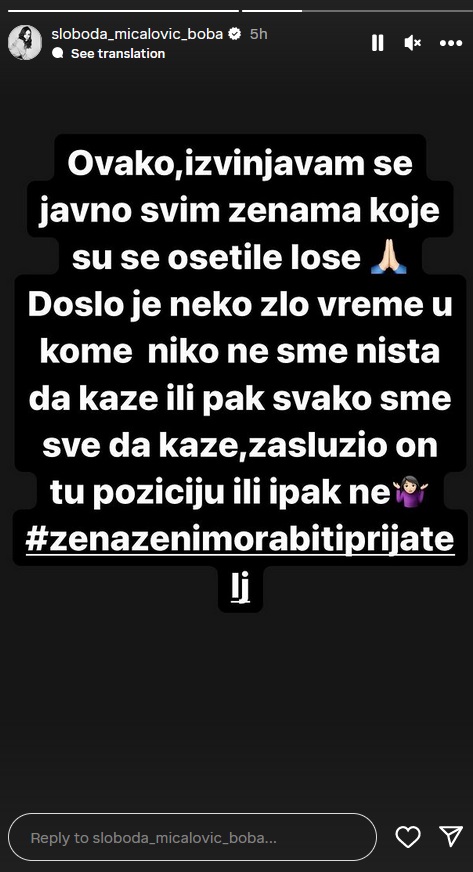 - Овако, извињавам се јавно свим женама које су се осетиле лоше. Дошло је неко зло време у коме нико не сме ништа да каже, или пак свако сме све да каже, заслужио он ту позицију или пак не - написала је глумица уз хештаг: Жена жени мора бити пријатељ.