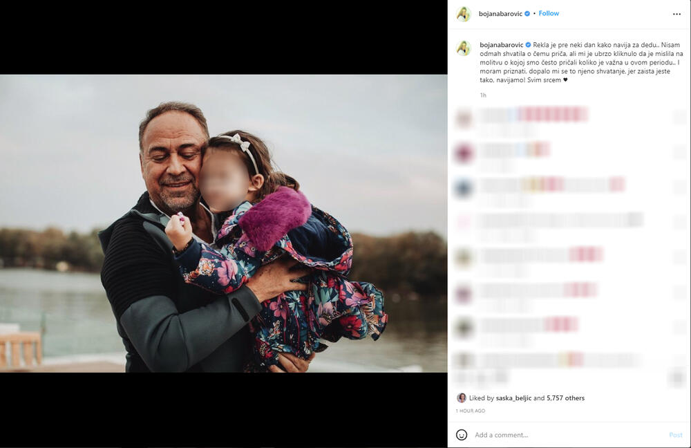 - Рекла је пре неки дан како навија за деду... Нисам одмах схватила о чему прича, али ми је убрзо кликнуло да је мислила на молитву о којој смо често причали колико је важна у овом периоду... И морам признати, допало ми се то њено схватање, јер заиста јесте тако, навијамо! Свим срцем - написала је Бојана.