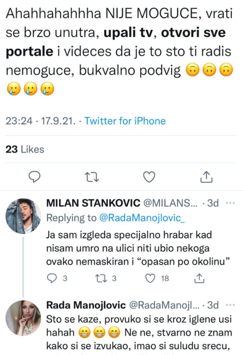 - Данас сам изашао из куће и жив сам - написао је Милан статус на Твитеру, а онда је уследио и коментар Раде Манојловић.