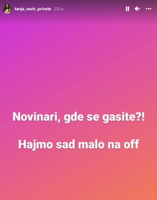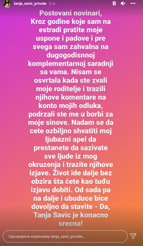 - Поштовани новинари, кроз године које сам на естради пратите моје успоне и падове и пре свега сам захвална на дугогодишњој, комплементарној сарадњи са вама. Нисам се освртала када сте звали моје родитеље и тражили њихове коментаре на конто мојих одлука, подржали сте ме у борби за моје синове. Надам се да ћете озбиљно схватити мој љубазни апел да престанете да сазивате све људе из мог окружења и тражите њихове изјаве. Живот иде даље без обзира шта ћете као туђу изјаву добити. Од сада па надаље и убудуће биће довољно да ставите - Да, Тања Савић је коначно срећна - написала је она у својој Интаграм причи.