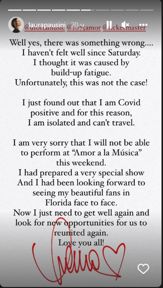 Не осећам се добро од суботе и управо сам открила да сам позитивна на цовид-19 и из тога сам разлога у самоизолацији и не могу да путујем - додала је Паузини у истој објави.