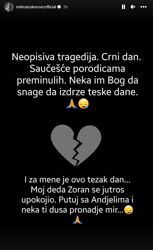 - Неописива трагедија. Црни дан. Саучешће породицама преминулих. Нека им Бог да снаге да издрже тешке дане. И за мене је ово тежак дан… Мој деда Зоран се јутрос упокојио. Путуј са анђелилма и нека ти душа пронађе мир - написала је у објави на свом Инстаграм профилу.