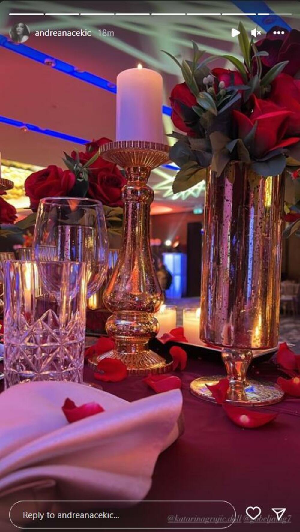 Преко 500 званица ужива у гала прослави, која ће трајати до раних јутарњих часова. Сваки детаљ је испланиран, а у сали за венчање преовладавају розе и златни тонови. Свадбена Торта биће на 15 спратова.