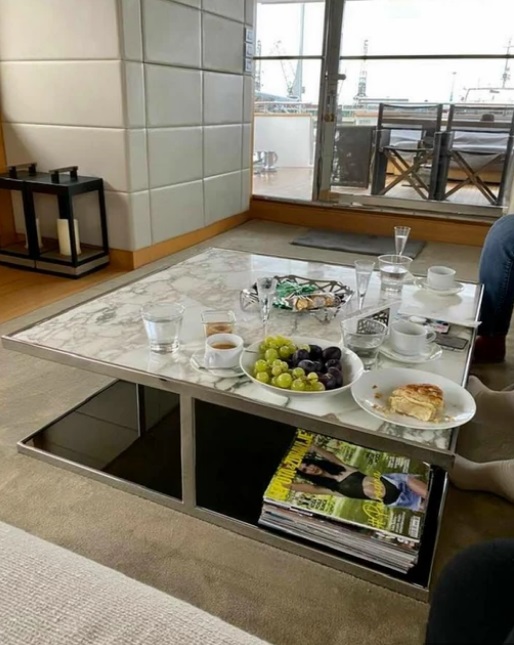 Дневни боравак је простран, са великим телевизором, а на мермерном столу, сем посластица и воћа, види се и новчаник пун еврића.