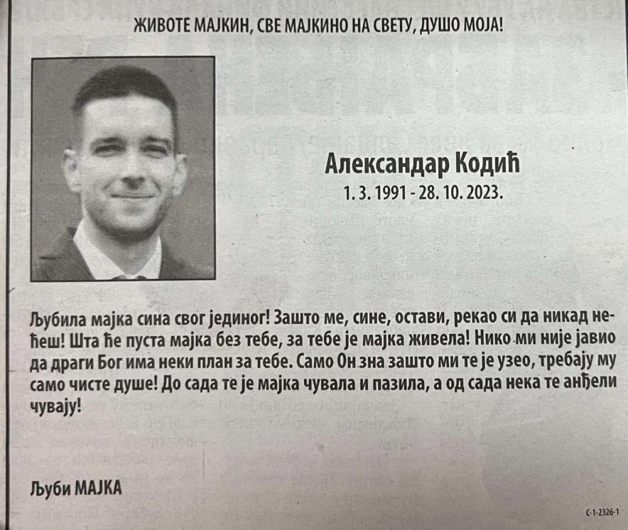 Александрова мајка се огласила у читуљи која се може пронаћи у новинама. Њен опроштај од сина расплакао би и оне са најтврђим срцима.