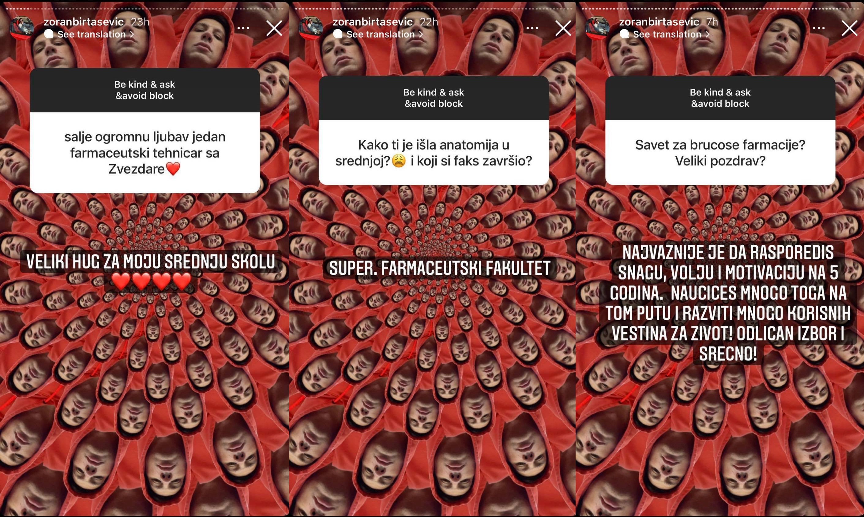 Ипак, мало ко зна шта је по професији Зоран Бирташевић. Веровали или не, завршио је најпре медицинску школу у Београду, на Звездари, да би потом уписао и у року завршио Фармацеутски факултет Универзитета у Београду, Одговоарајући на питања својих пратилаца на друштвеној мрежи Инстаграма, Бирташевић је открио и да је и најтеже предмете полагао са лакоћом.