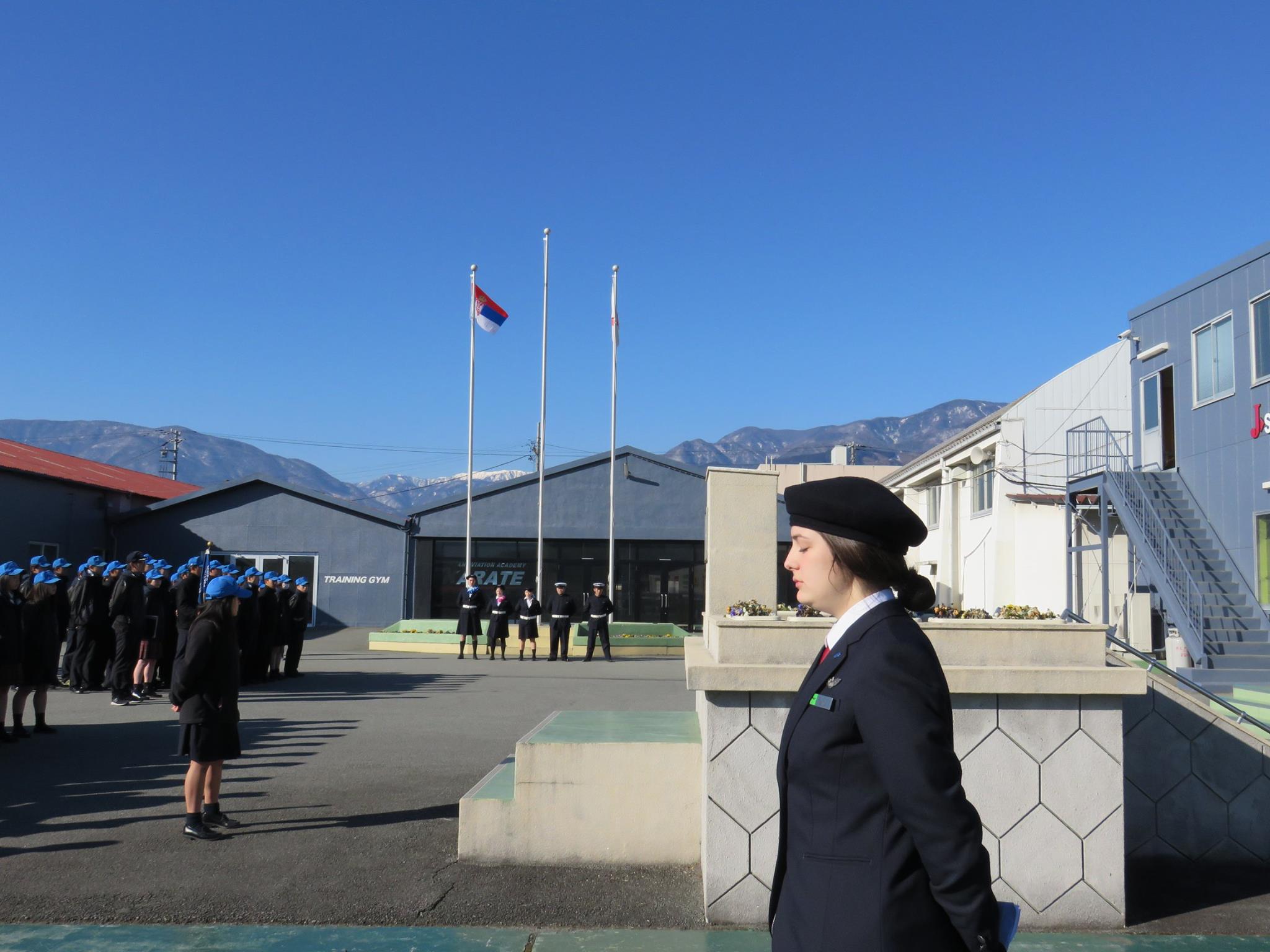 У мојој школи (Јапанска авио академија), има доста странаца. Баш из тог разлога, сваке године на дан државности сваке од држава из којих се студенти школују у том тренутку (Монголија, Тајланд, Кина, Кореја, Индија и Србија), дан се посвети тим државама. Почиње се и завршава подизањем заставе и пуштањем химне те државе. Наравно, заједно са јапанском заставом. Цела школа се окупи испред стубова где иначе стоји јапанска застава и почиње церемонија…