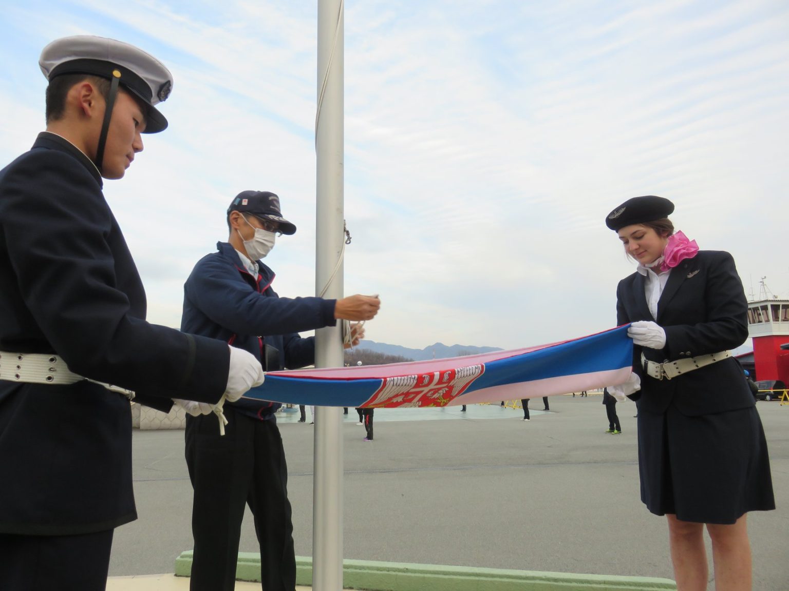 Неколико ђака маршира ка стубовима, носећи обе заставе. Када дођу у позицију, пушта се јапанска химна и диже се јапанска застава. Након тога прати је застава и химна државе која се слави.