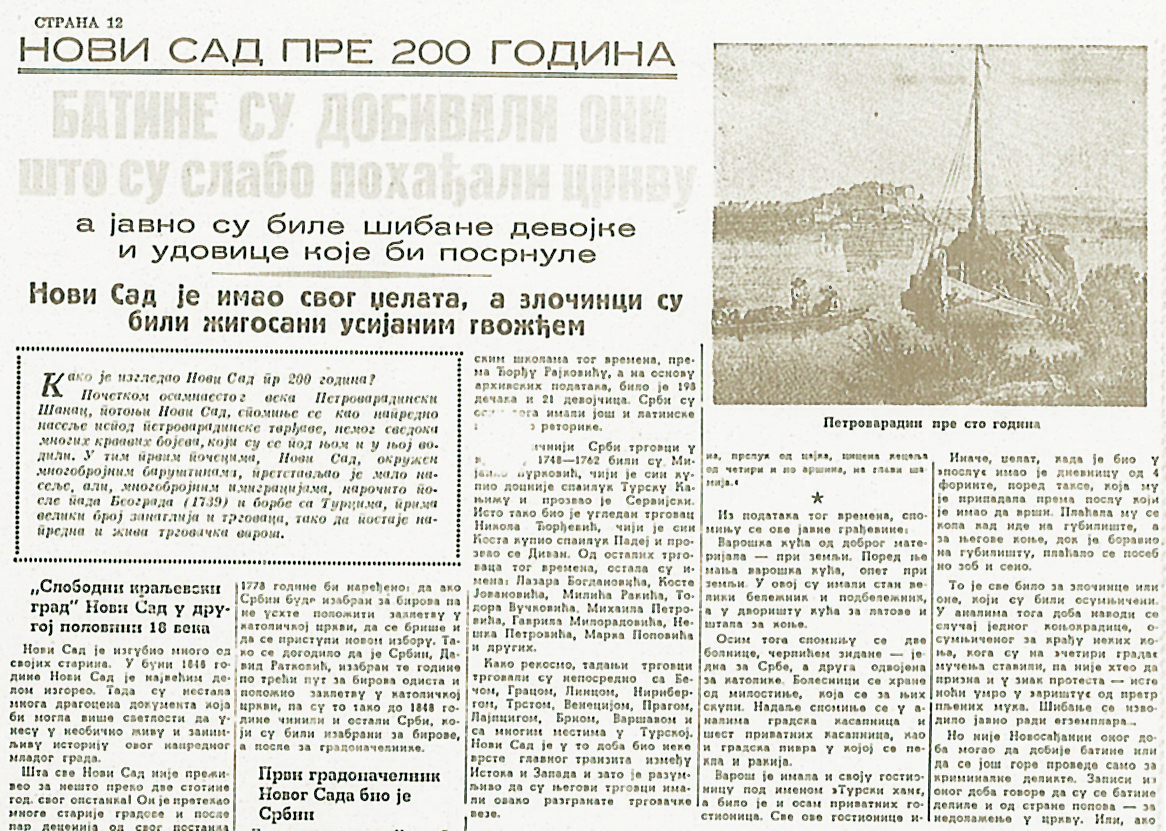 Дневни лист “Време” пише да су у Новом Саду пре три века: “Батине добивали они што су слабо посећивали цркву, а јавно су биле шибане девојке и удовице које би посрнуле”. У поднаслову, тек нешто ситнијим словима, записано је и како је “Нови Сад имао свог џелата, а злочинци су били жигосани усијаним гвожђем”.