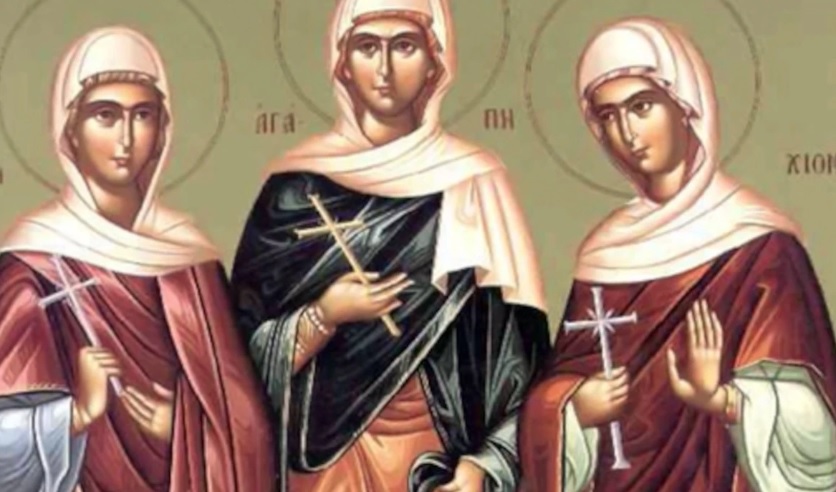 Оне су биле сестре рођене, из околине Аквилеје (или Солуна). Када је цар Диоклецијан био у Аквилеји наредио је да се погуби знаменити духовник Хрисогон. У то време неки стари презвитер Зоил је, како хришћани верују, имао виђење којим му се открило, где се налази тело Хрисогоново несахрањено. Старац је нашао тело мучениково, положио га у сандук и држао у своме дому. Хришћани верују да му се тридесети дан после тога јавио Свети Хрисогон и известио га, да ће у току девет дана оне три девојке мученички пострадати, а да ће и он у то време преминути. Исту визију имала је и Анастасија Узорешителница, која је пошла за својим учитељем Хрисогоном.И заиста после 9 дана и старац Зоил је преминуо, и ове три сестре су изведене на суд пред цара. Цар је саветовао девојке, да се поклоне идолима, али оне су то одбиле и исповедиле своју веру у Христа. Ирина је рекла цару, како је глупо клањати се стварима од камена и дрвета, које су поручене, за погођену цену, да се направе рукама каквог смртног човека.