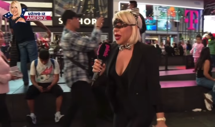 - Добро вече Србијо, добро вече верни гледаоци! Ја не знам да ли преко екрана можете да осетите ову атмосферу. Мени је први пут да сам осетила ову атмосферу. Има ту једна лопта, која, када одброји 12 увече, поноћ, лопта се спушта и одбројава се 10,9, 8,7... Али ми не ћекамо Нову годину, вечерас је Ноћ вештица. Много је ту костима, разних врста, неки су интересантни, неки су "скери". Ја сам покушала да имитирам жену мачку, када је Хали Бери добила лошу оцену, а тај филм је погледало много људи - рекла је Јована.
