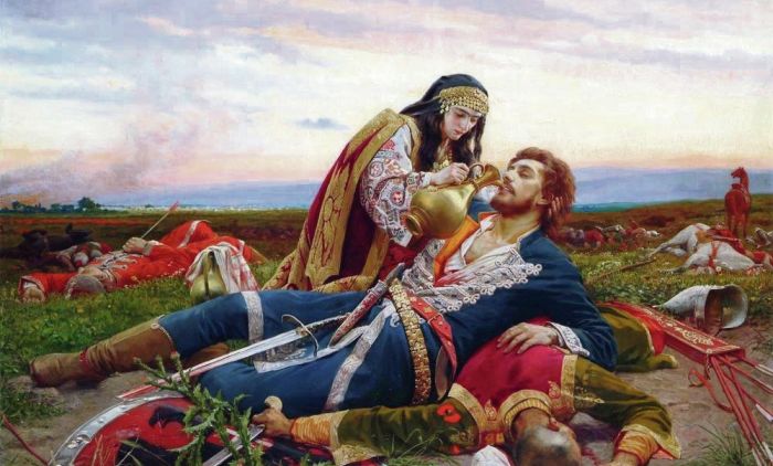 Међутим, пошто је јунак изгубио живот у борби, Косовка девојка је постала ожалошћена вереница, која након битке, лута бојним пољем у потрази за вереником, негује и окрепљује преживеле.