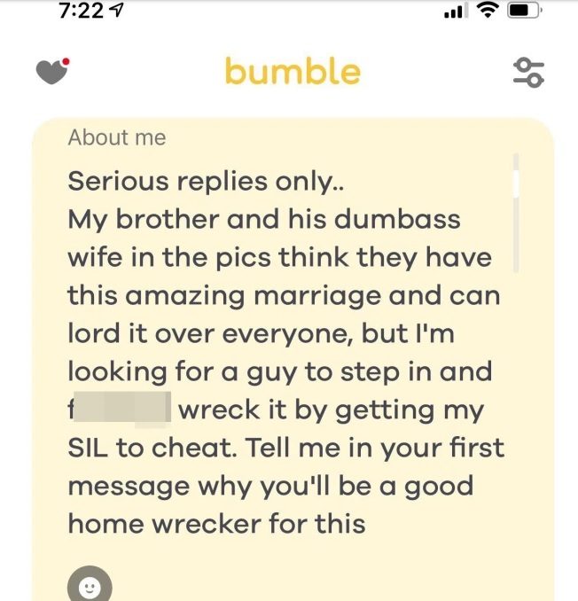 - Мој брат и његова глупа жена, имају сјајан брак и свима га гурају под нос. Али ја тражим мушкарца који ће се умешати у њихов брак и натерати моју снајку на аферу. Пошаљите ми поруку и објасните зашто бисте били добар кандидат - написала је на профилу.