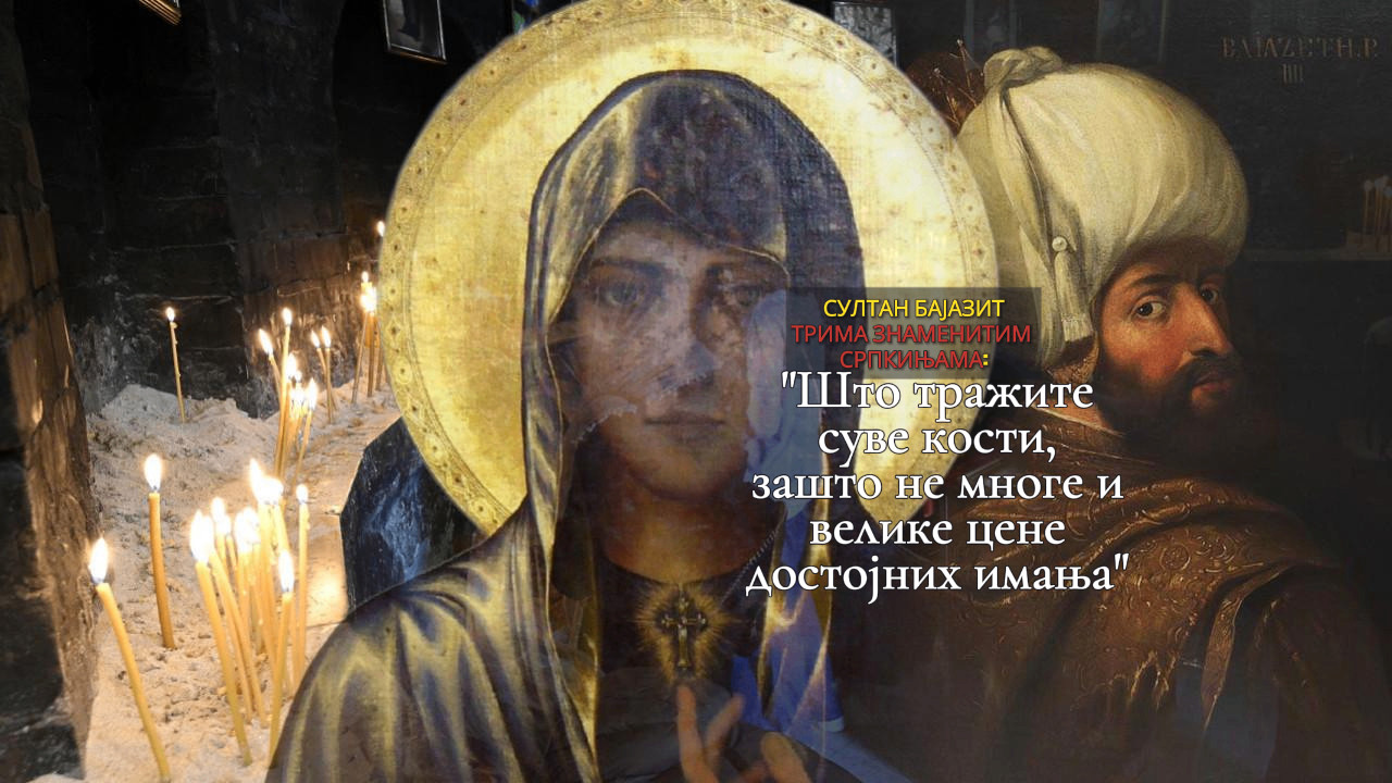 Три знамените Српкиње - кнегиња Милица, деспотица Јефимија и Миличина кћерка Оливера, која је била Бајазитова жена, и молиле су да се мошти Свете Петке пренесу у Србију.