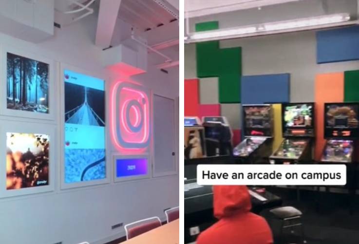 Главни улазни простор компаније састоји се од фотографија с Инстаграма, укључујући слике мачака с хасхтагом #цатсофинстаграм, док су друга места дизајнирана за савршене селфиеје. Додала је и да је кампус осмишљен тако да изгледа попут Дизниленда и центра града Пало Алто, а садржи и играоницу где запослени могу да се опусте, као и радња са слаткишима у којој је такође све бесолатно.
