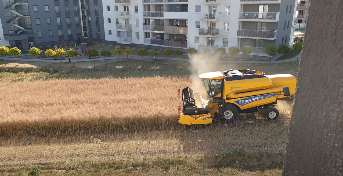 На снимцима се види како Михал Мисловски довози свој комбајн на поље удаљено само неколико метара од суседних зграда у Лублину у Пољској.
