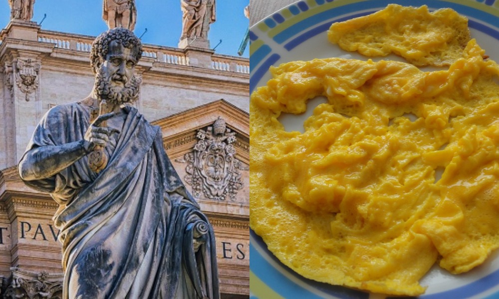 У песми под насловом Скупа кајгана светог Петра говори се о томе како су Исус Христос и апостол Петар ишли по свету да кушају људе. Уз то, „Христос куша још и Петра свог”. Једне вечери преспавали су у колиби сиромашне удовице Рајке, која је имала нејаке деце. Она их лепо дочека и понуси им кајгану за вечеру. Христос то одбије и оде на сламу да спава, упозоривши Петра: „Не заложи вечерице њене, вечерице деци зготовљене”. Петар коме је било доста гладовања, не послуша Исуса, дохвати се кајгане, али се она у истом часу окамени тако да је није могао јести.