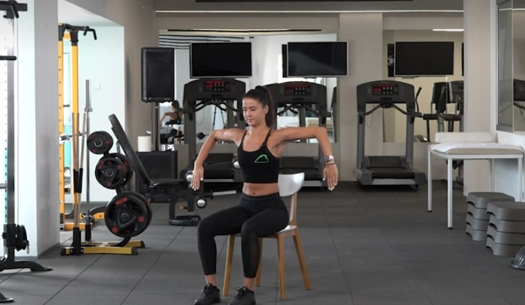 Руке су под углом од 90 степени, а лопатице су спојене, леђа су све време права. Задржавате положај, а онда лагано спуштате руке ка доле. Задржите у доњем положају, а затим вратите. Вежбу поновите десет пута.