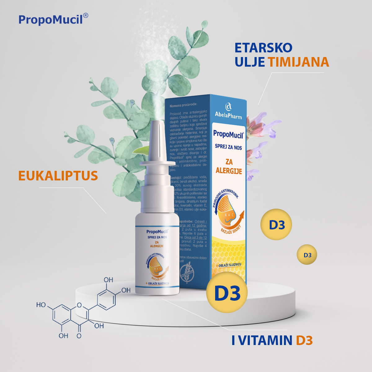 Најбитније је смањити утицај алергена (супстанце из спољне средине) и слузнице носа. Пре сваког изласка из затвореног простора препорука је да се користи спреј за нос који доприноси спречавању контакта алергена са слузницом носа. Пропомуцил® спреју за нос за алергије облаже слузницу носа, као и свих горњих дисајних путева. На тај начин ствара заштитну баријеру од супстанци из спољне средине и доприноси спречавању њиховог везивање. Због тога је онемогућен контакт алергена и слузнице носа, а самим тим се смањује и могућност настанка алергијске реакције. Пропомуцил® спреју за нос за алергије садржи и кверцетин (једињење које синтетишу биљке). Он блокира синнтезу и ослобађање хистамина и тиме ублажава симптоме алергијског ринитиса. Еукалиптус који се налази у Пропомуцил® спреју за нос за алергије помаже код запушености носа и олакшава дисање.