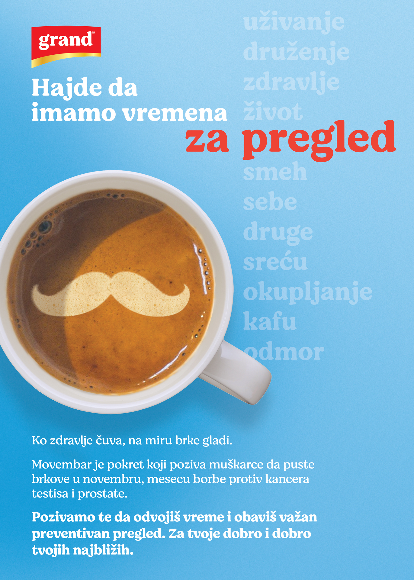 Без обзира на то што се о овој теми, како у медијима тако и на социјалним мрежама, па и у медицинским круговима највише говори крајем године, током месеца новембра, за лекарске прегледе и бригу о здрављу треба издвојити време било ког дана у години. Хајде да имамо времена за прегледе, слоган је кампање Гранд кафе, која је у сарадњи са Институтом за здравље Србије “Др Милан Јовановић Батут“, Министарством здравља и фондом Б92 током месеца октобра спровела низ активности у циљу подизања свести о важности ране дијагностике рака дојке. Огромно интересовање за бесплатне мамографске прегледе који су у склопу акције организовани у Неготину, а након тога и у Београду само су потврдили важност ове теме као и наставка саме кампање. Зато сада у новембру позивамо све мушкарце да бар један дан у овом месецу одвоје времена за себе, своје здравље и превентивни преглед код уролога. Будите одговорни према себи и својим вољенима јер увек је прави тренутак за бригу о свом здрављу!