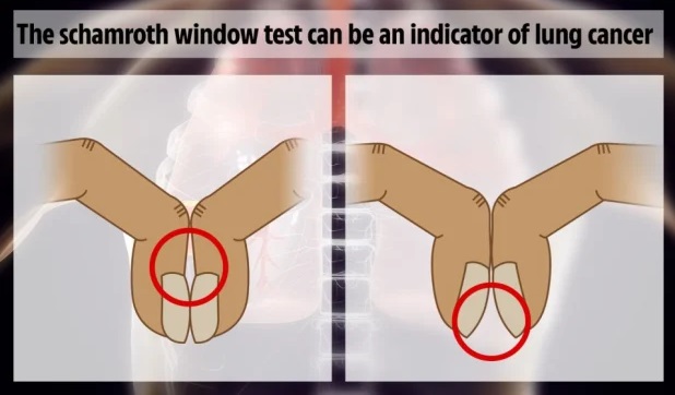 Тест прстију са „дијамантским размаком“, познат и као Шамротов тест прозора, могао би вам помоћи да рано уочите рак плућа . То укључује спајање ноктију да видите да ли постоји простор у облику дијаманта између ваших заноктица.