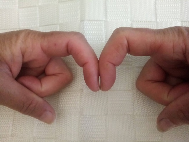 Спојите нокте кажипрста један уз други. Потражите мали простор у облику дијаманта између заноктица, кроз који пролази светлост. Ако нема места, а нокти се додирују, то је знак кривљења прста. Крајеви прстију могу бити већи него обично, а нокти закривљени.