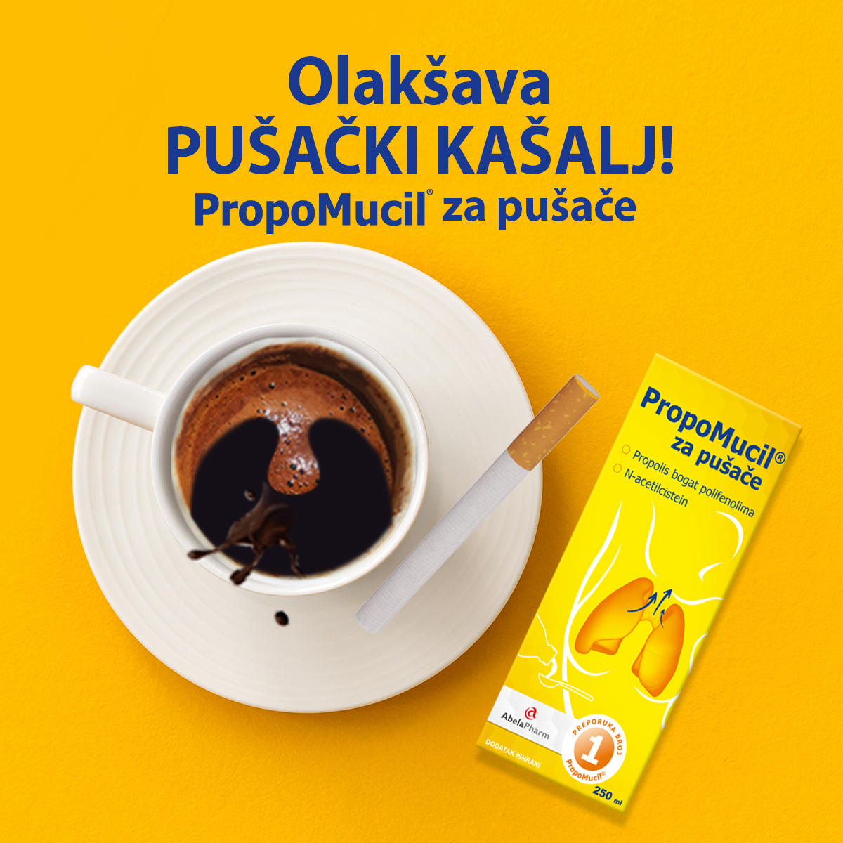 За мене је препорука број један ПропоМуцил® за пушаче јер представља јединствену комбинацију прополиса богатог полифенолима и Н-ацетилцистеина, који удружено помажу елиминацију секрета, а додатак меда, те екстракта белог слеза, јагорчевине и нане доприносе здрављу дисајних путева. Пропомуцил® за пушаче чисти бронхије, дисајне путеве и олакшава дисање, додатно помаже у искашљавању секрета и смањењу надражаја, па олакшава пушачки кашаљ. ПропоМуцил® за пушаче у свакодневној примени добра је заштита дисајних путева како код активних пушача, тако и код особа које остављају пушење – на крају саветује Доц. др Виолета Коларов.
