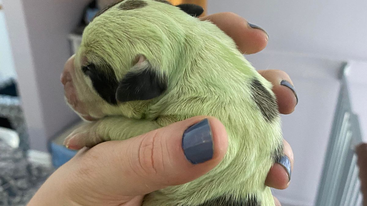 Булдог је на свет донео „чудесно“ штене са светлозеленим крзном. Тревор и Одра Мошер, помислили су најгоре након што су видели необичну боју штенета и испрва су помислили да је мртворођено.