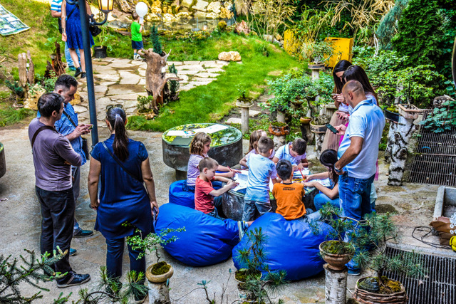 Акваријум који доминира простором је дугачак 6 метара и налази се на висини од 3 метра. У њему се налазе КОИ шарани од 15 до 40 цм дужине разних боја- од беле, преко жуте, до црвене и плавичасте. Клинцима и клинцезама посебно занимљив биће 'беби кутак' у коме живе мајушне беби рибице.