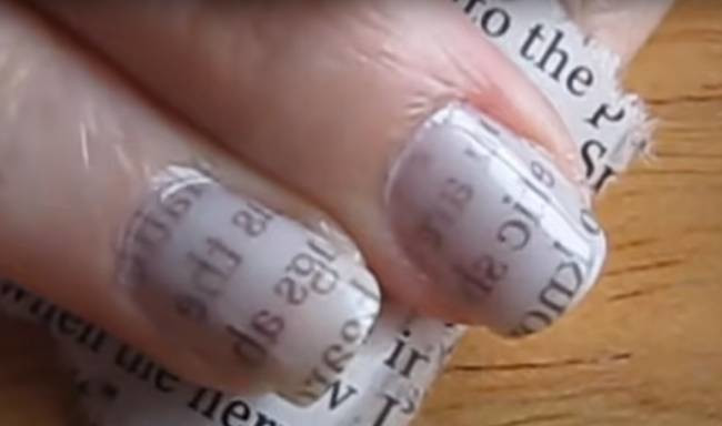 Све што вам је потребно су сиви и безбојни лак за нокте, парче новине и алкохол. Алкохол сипајте у посудицу, а затим на нокат нанесите базу. Потопите нокат у алкохол и држите га 15-ак секунди. Након тога, налепите парче новине на нокат и сачејахте док се слова не пресликају.