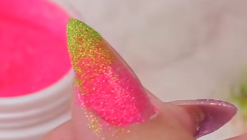 Један нокат се лакира цео у једној, рецимо розе боји. На другом се лакира половина у једној, а друга половина у другој боји. Трећи се лакира попречним пресеком. Ово се једноставније постиже поменутим прахом, али и обичним лаковима са шљокицама ако се сачека да се прва боја добро осуши.