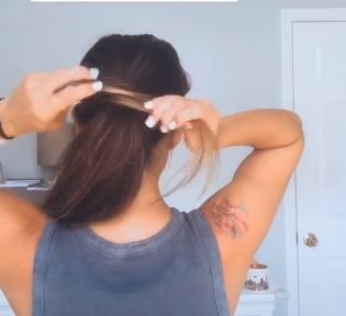 Потребно је да предњи (горњи) део косе, поделиш на два дела. Потом доњи део косе покупи у реп, на висини којој желиш. Затим први део косе коју си одвојила, мало натапирај, па споји са репом, док остатак само треба да привежеш испод репа.