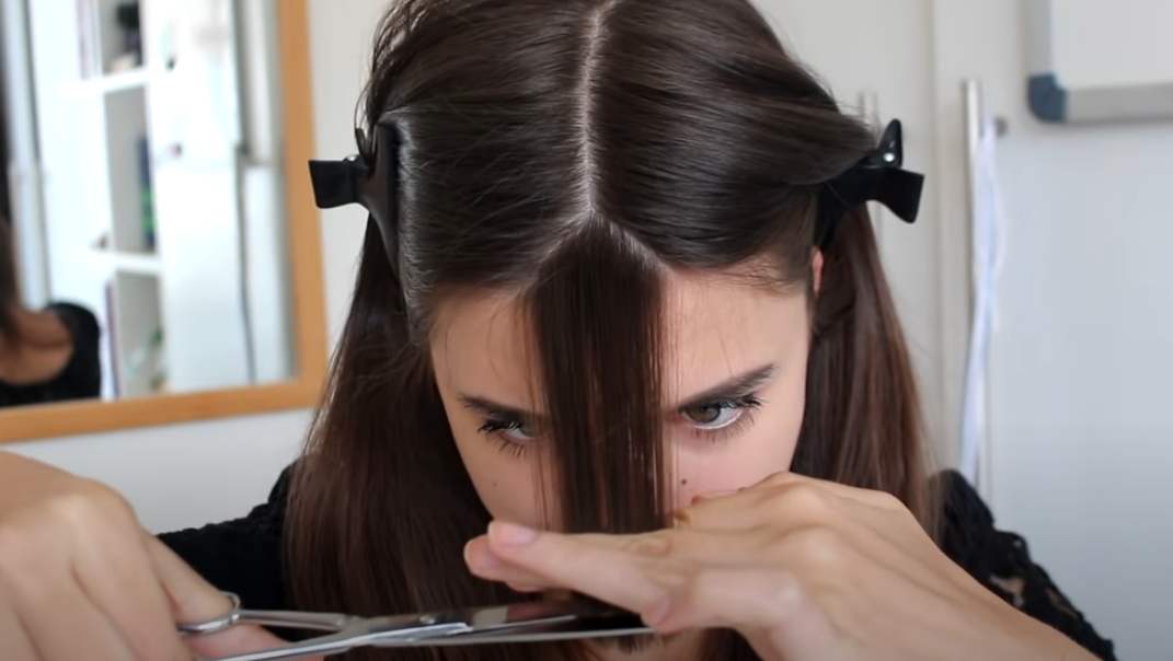 Одвојену косу (будуће шишке) исправите напред, ставите прсте на део косе који хоћете да ошишате и маказама исеците испод прстију. Када скупите довољно храбрости, овај део поновите да бисте добили жељену величину шишки.