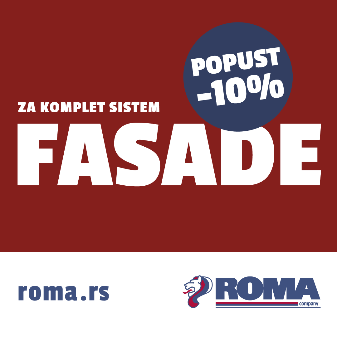 У свему томе вам овог пролећа помаже ROMA Company. Уз 10% попуста на комплет фасада, обезбедићете дугорочни квалитет, енергетску ефикасност и заштиту за ваш дом. Комплет фасада обухвата стиропор, лепак, мрежицу, малтер и типлове.