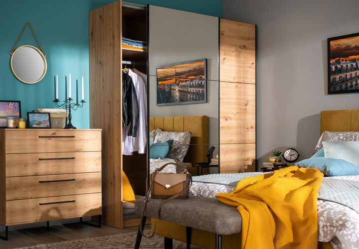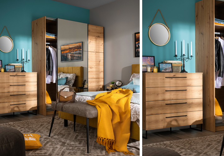 Савет је да у модерно-рустичном простору мешате потпуно супротне материјале. Гардеробер СИЕРРА 180 ОГ у декору артисан храста са огледалом на једном крилу представља модел гардеробера савременог дизајна, а чини га управо спој супротних материјала. Комода САРДИНИА 4Ф такође би се одлично уклопила у предложени амбијент, а спој је топлине натуралног и рустичног артисан храста са примесама контрасних суптилних црних елемената декора.