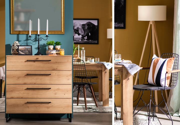 Уз минималистичку лампу и црно-белу слику на зиду, добија се модерна трпезарија оплемењена рустичним дрво декором. Уколико имате довољно простора на располагању, предлажемо и додавање комоде нешто мањих димензија, попут комоде САРДИНИА 4Ф, која ће уз аутентично зидно огледало и упечатљив свећњак постати фокусна тачка ваше трпезарије.